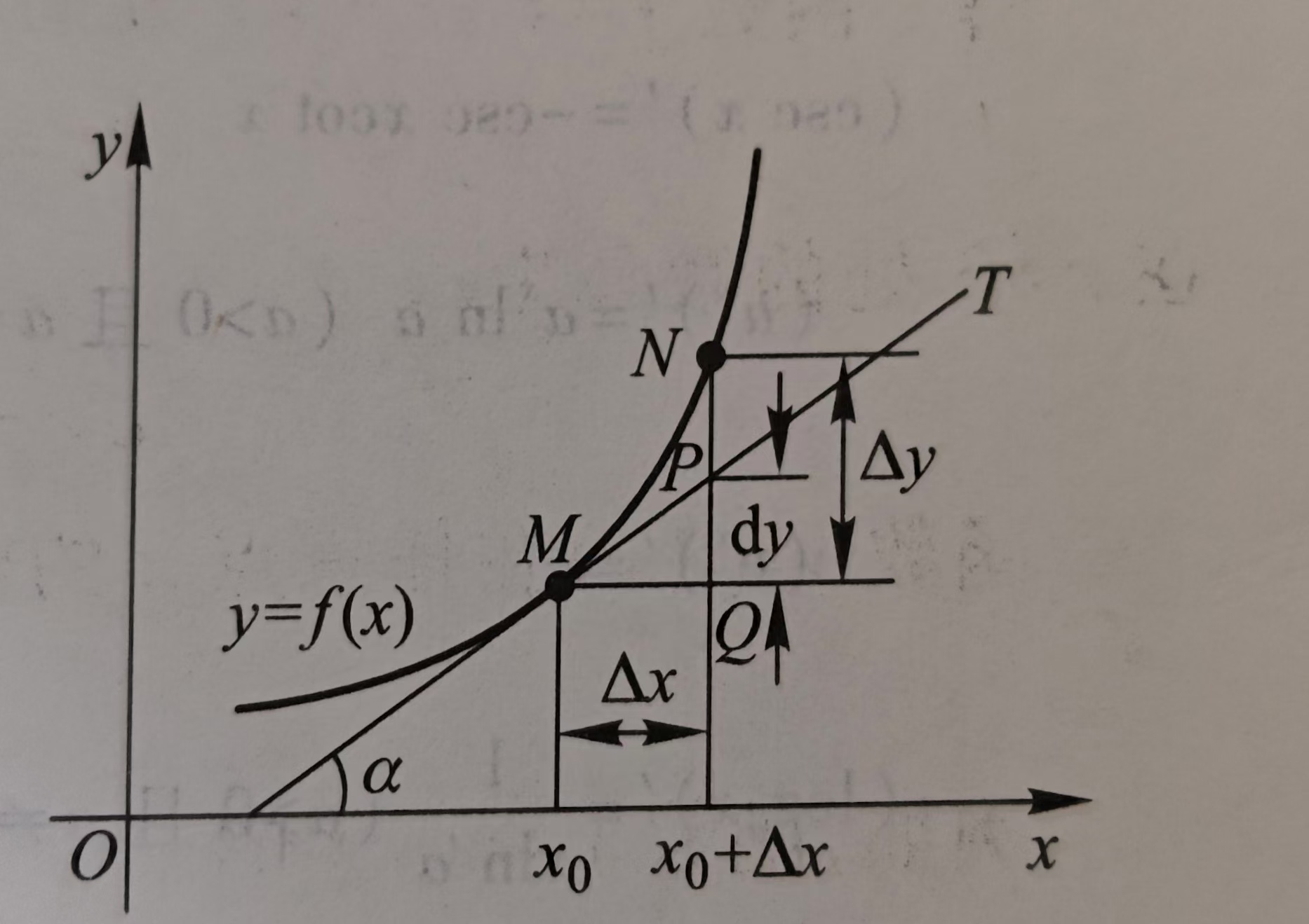 $\hspace{6em}y=f(x)在x_0处的微分:dy= A\Delta x =f'(x_0)\Delta x $